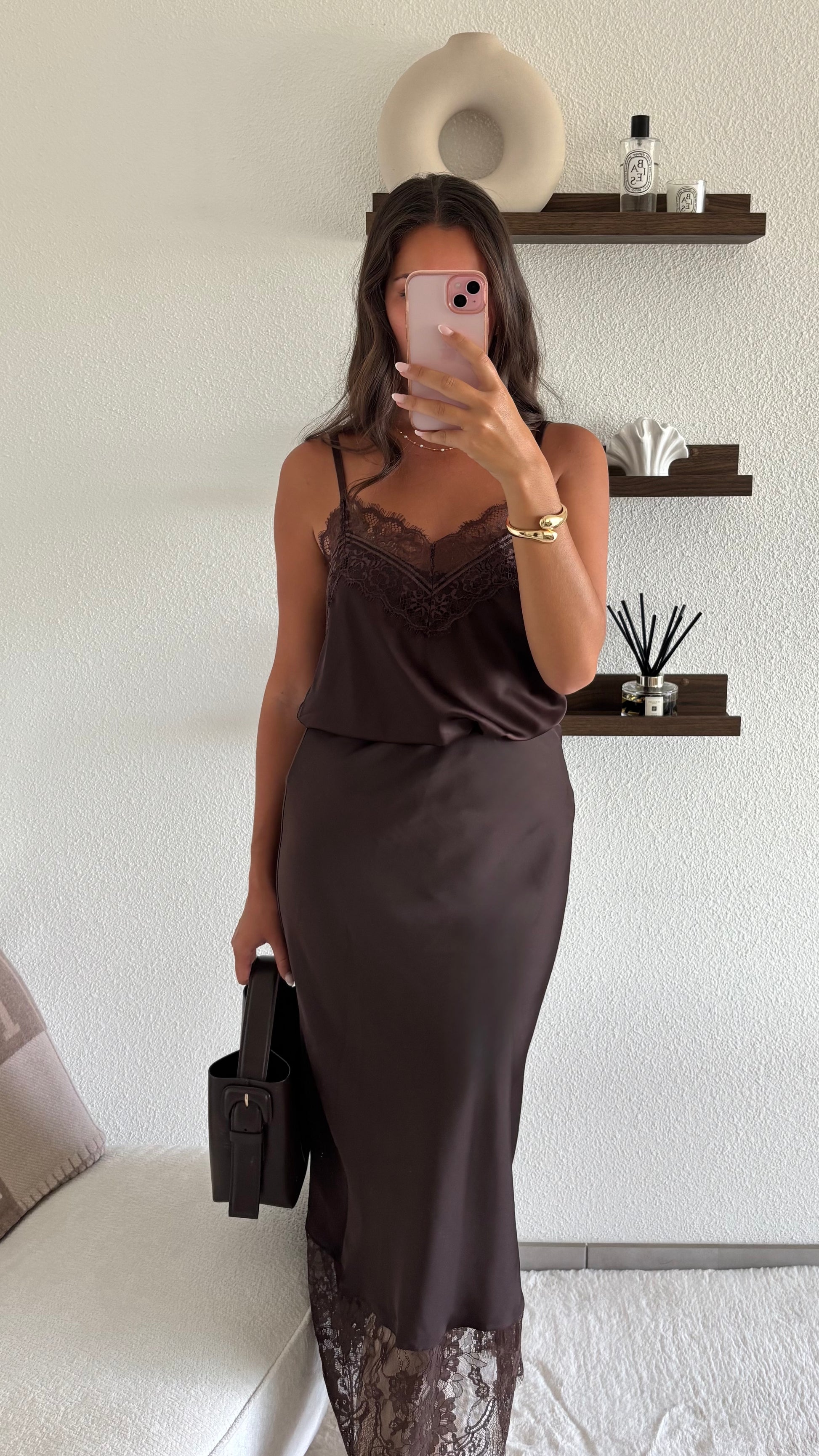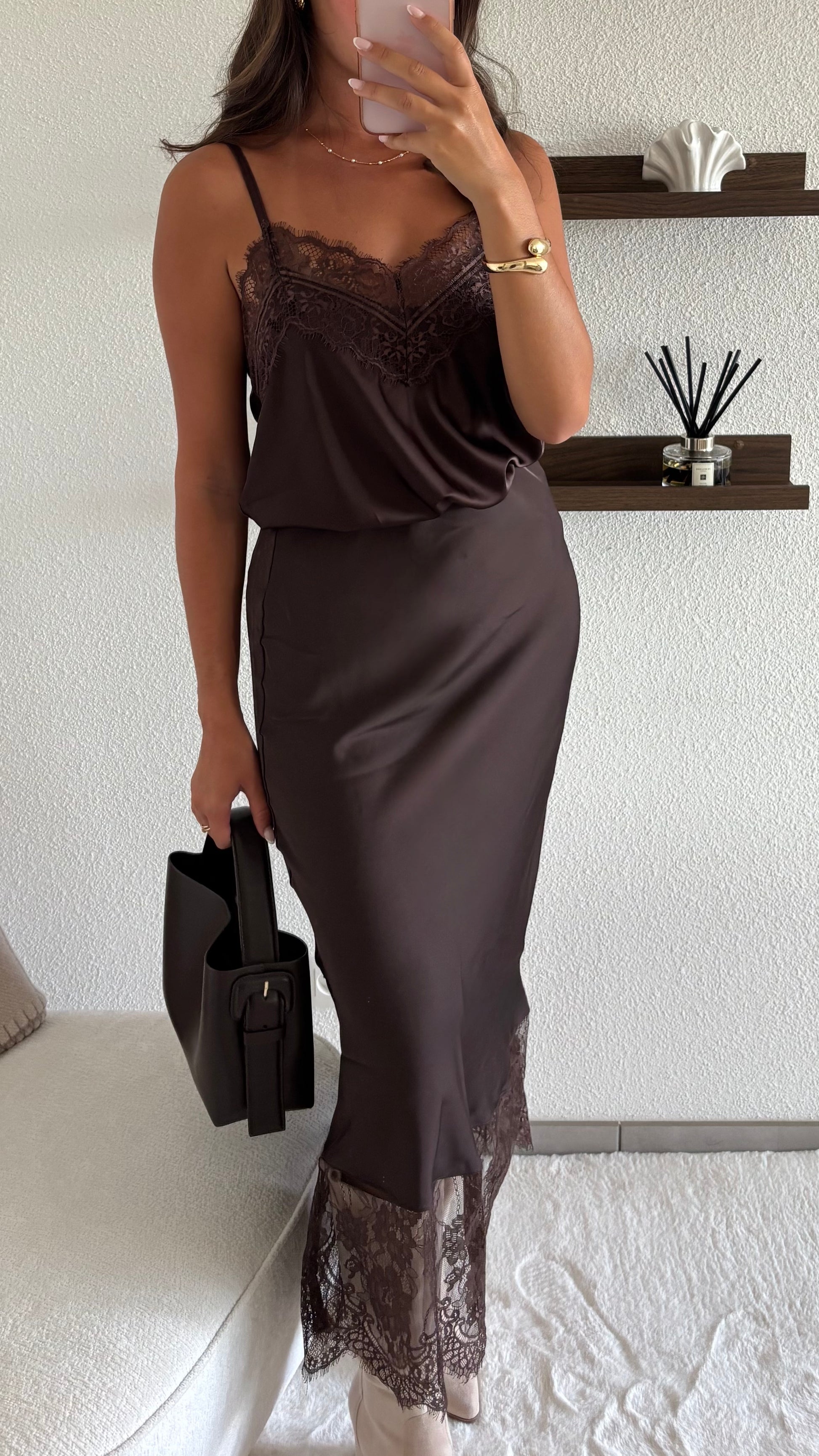 - Il est satiné avec des détails de dentelle sur le haut